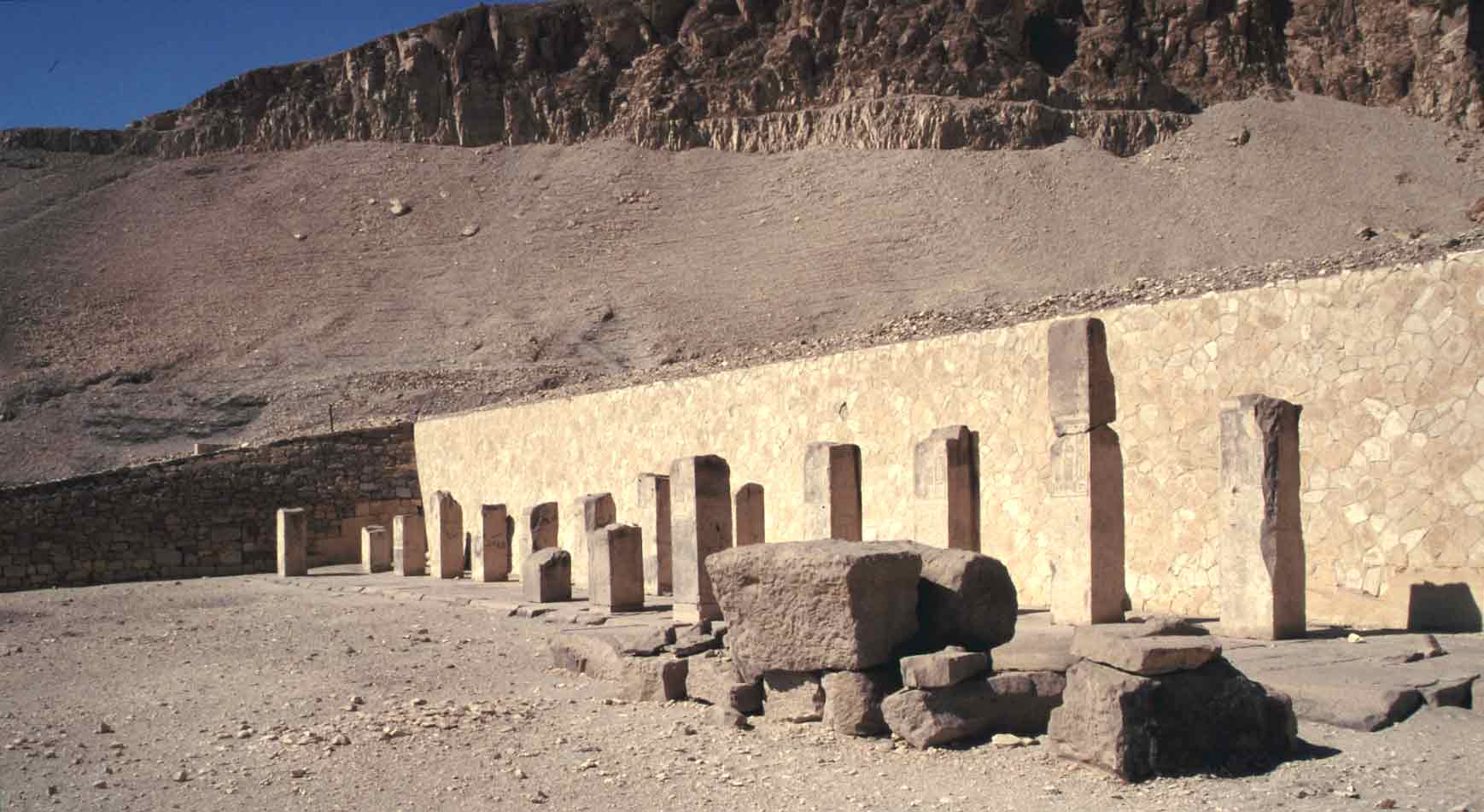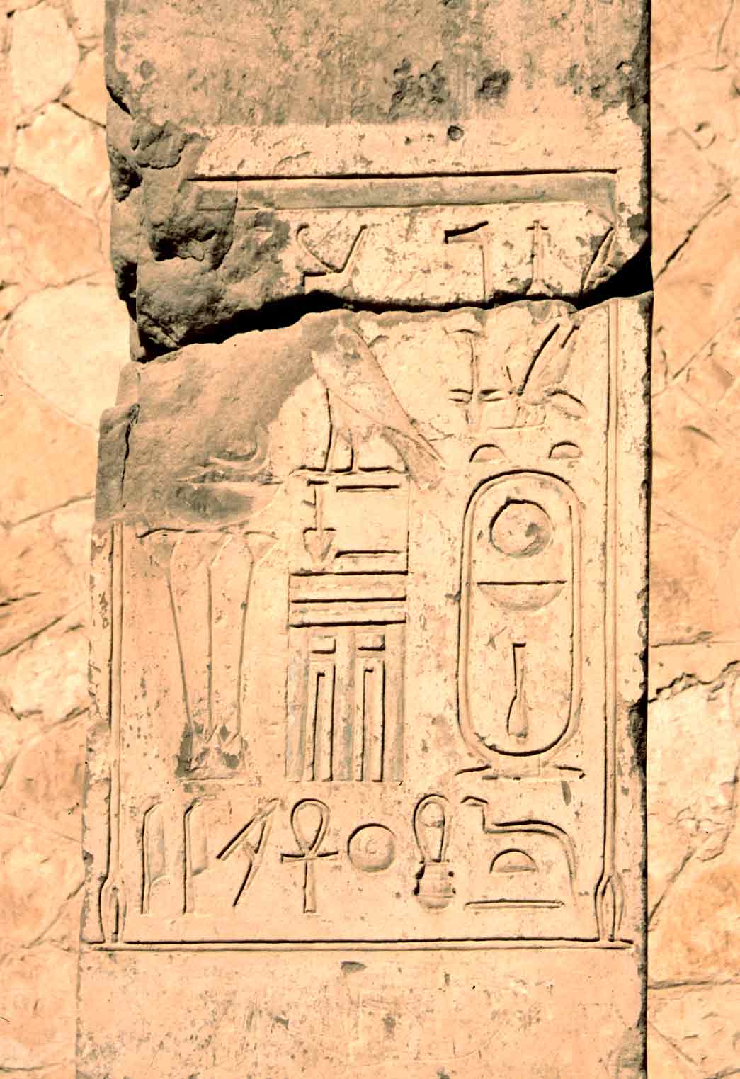 Here is a detail of one of the pillars. It carries the Horus name (in the middle) and throne name (to the right) of Mentuhotep II, in the 3rd (and final) version of his titulary (see v. Beckerath, Handbuch 79). It corresponds with the period after the reunification of the country. That is why the Horus name (and the Nebty name) of this period read Sma Tawy: "He who unites the two lands".
