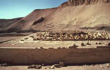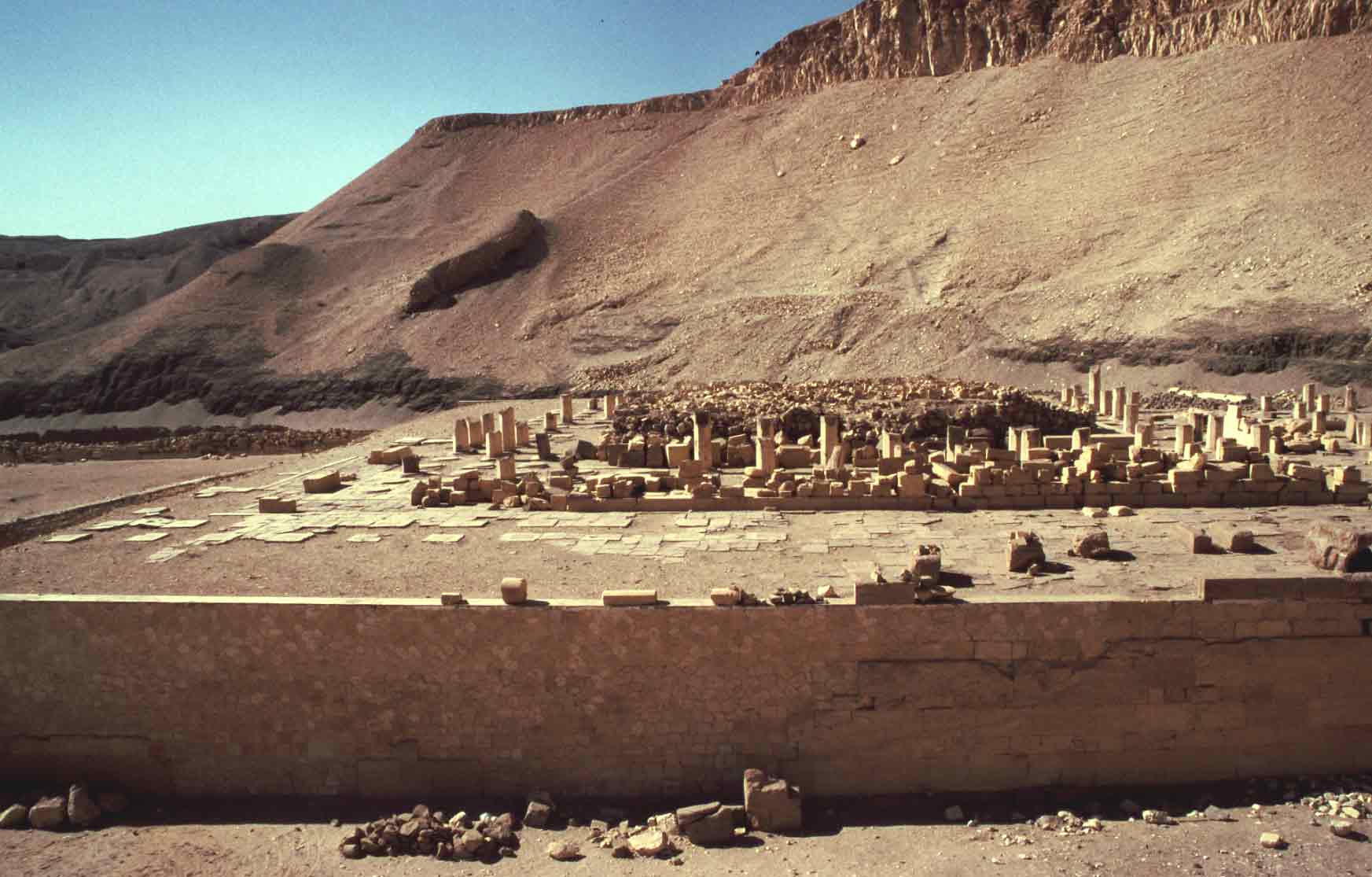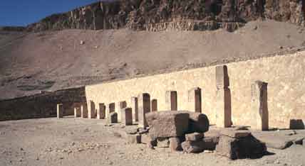 This is the eastern front of the platform (with the ramp in the background). It was once adorned with a pillared gallery, much the same as can be found in "H". Although the basic characteristics of "M" and "H" are completely different, some of the architectural elements of "M" have been used again in "H". The pillared gallery is one of these.