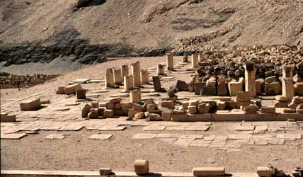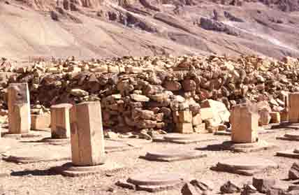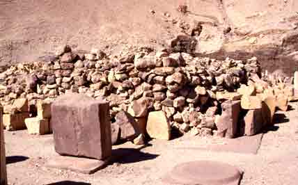 This is a close up from the same position as the previous picture. As you can see, the platform once had a pavement. On it stood the central feature of the complex: the solid "mastaba" of which you can here see the north-eastern corner. It was surrounded by columned halls. (The lower end of the picture is formed by the northern side wall of the platform).