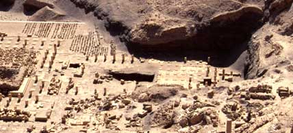 Behind (and originally obscured by) the "mastaba" lies a relatively narrow section that cuts into the face of the cliff. Almost midway between the "mastaba" and the cliff you can see a trench that descends into the surface. It is the entrance to the tomb.